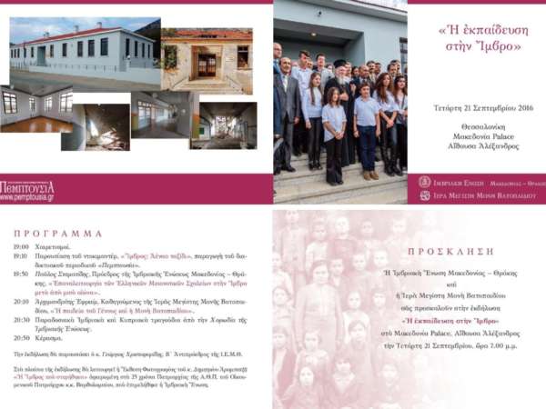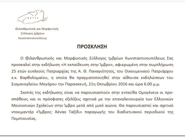 Εκδήλωση: «Η ΕΚΠΑΙΔΕΥΣΗ ΣΤΗΝ ΙΜΒΡΟ» ΣΤΟ ΣΙΣΜΑΝΟΓΛΕΙΟ ΜΕΓΑΡΟ ΣΤΙΣ 21 ΟΚΤΩΒΡΙΟΥ 2016 ΠΡΟΣ ΤΙΜΗΝ ΤΗΣ Α.Θ. ΠΑΝΑΓΙΟΤΗΤΟΣ ΤΟΥ ΟΙΚΟΥΜΕΝΙΚΟΥ ΠΑΤΡΙΑΡΧΟΥ κ.κ. ΒΑΡΘΟΛΟΜΑΙΟΥ ΠΡΟΓΡΑΜΜΑ Χαιρετισμός Εξοχ. Πρέσβεως κ. Ευαγγέλου Σέκερη, Γενικού Προξένου της Ελλάδος στην Κωνσταντινούπολη Χαιρετισμός της Προέδρου του Συλλόγου Ευγεν. κ. Παναγιώτας Λαγοσπύρη Μαρφιάδου Προβολή ντοκιμαντέρ της Διαδικτυακής Ομάδος της Πεμπτουσίας υπό τον τίτλον «Ἴμβρος: Ἀέναο Ταξίδι». Προλογίζεται υπό του Εντιμ. κ. Νικολάου Γκουράρου. Ομιλία Εντιμολ. Άρχοντος Μ. Χαρτοφύλακος της Μ.τ.Χ.Ε. κ. Παντελεήμονος Βίγκα, Προέδρου του Εκπαιδευτικού και ΠολιτιστικούΣυλλόγου Ίμβρου (ΕΠΣΙ) Ομιλία Εντιμ. Κ. Παύλου Σταματίδη, Προέδρου της Ιμβριακής Ενώσεως Μακεδονίας Θράκης με τίτλον «Επαναλειτουργία των Εληνικών Μειονοτικών Σχολείων στην Ίμβρο Μετά από Μισό Αιώνα» Ομιλία του Αιδεσιμολ. Πρωτοπρεσβυτέρου του Οικουμενικού Θρόνου κ. Δοσιθέου Αναγωνστόπουλου Χαιρετισμός του Συντονιστή Εκπαίδευσης της Ομογενειακής Παιδείας Ελλογιμ. κ. Σταύρου Γιολτζόγλου…
