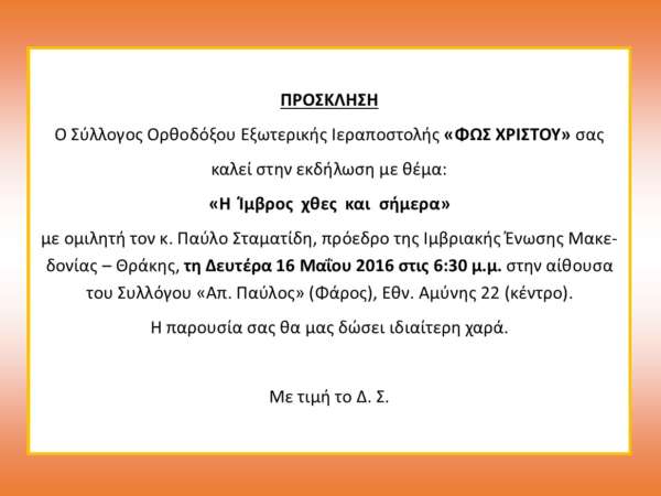 Εκδήλωση: “Η Ίμβρος χθες και σήμερα” Ο Σύλλογος Ορθοδόξου Εξωτερικής Ιεραποστολής «ΦΩΣ ΧΡΙΣΤΟΥ» σας καλεί στην εκδήλωση με θέμα: «Η Ίμβρος χθες και σήμερα» με ομιλητή τον κ. Παύλο Σταματίδη, πρόεδρο της Ιμβριακής Ένωσης Μακεδονίας – Θράκης, τη Δευτέρα 16 Μαΐου 2016 στις 6:30 μ.μ. στην αίθουσα του Συλλόγου «Απ. Παύλος» (Φάρος), Εθν. Αμύνης 22 (κέντρο).