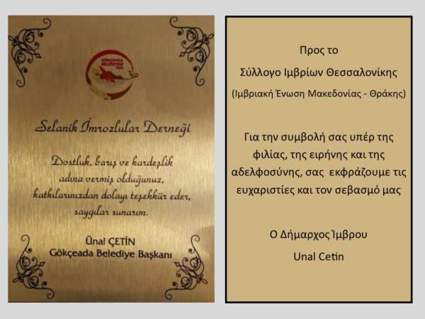 Απονομή πλακέτας από το Δημαρχείο Ίμβρου στην Ιμβριακή Ένωση Το Σάββατο 9 Απριλίου, στις 8.30 εκπρόσωποι του Δημάρχου και φορείς του νησιού παρέθεσαν δείπνο στον Πρόεδρο της Ιμβριακής Ένωσης Μακεδονίας – Θράκης κ. Παύλο Σταματίδη. Από πλευράς του Δήμου μεταξύ άλλων Δημοτικών Συμβούλων ήταν ο Ertugrul Eser και ο Temel Dagli. Στην πολύ ζεστή και φιλική ατμόσφαιρα στο ρεστοράν KALE ο κύριος Senol έκανε τα πάντα για να περιποιηθεί τους εκλεκτούς προσκεκλημένους. Παρών επίσης ο Πρόεδρος της Κοινότητας Αγίων Θεοδώρων κ. Ευστράτιος Ζούνης κι ο κ. Νικόλαος Δολδούρης. Οι εκπρόσωποι του Δήμου επιφύλασσαν μία έκπληξη στον Πρόεδρο της ΙΕΜΘ, του απένειμαν τιμητική πλακέτα για την Ιμβριακή Ένωση που έλεγε τα εξής: Προς το Σύλλογο Ιμβρίων Θεσσαλονίκης (Ιμβριακή Ένωση Μακεδονίας – Θράκης). Για την συμβολή σας υπέρ της φιλίας, της…