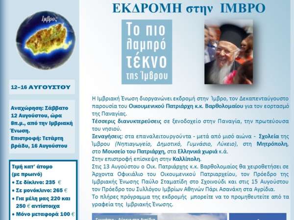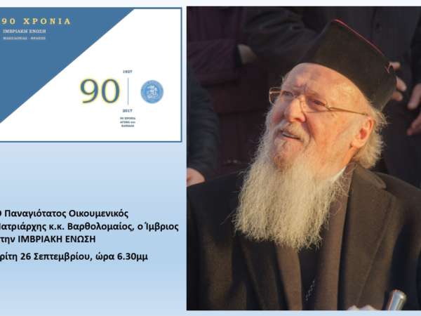 Ο Οικουμενικός Πατριάρχης στην Ιμβριακή Ένωση Την Τρίτη 26 Σεπτεμβρίου ο Παναγιότατος Οικουμενικός Πατριάρχης κ.κ. Βαρθολομαίος θα βρίσκεται στην Ιμβριακή Ένωση για τον εορτασμό των 90 χρόνων από την ίδρυση της Ενώσεως. Η είσοδος στο Πνευματικό Κέντρο της Ι.Ε.Μ.Θ. θα γίνεται με προσωπική πρόσκληση, την οποία μπορείτε να παραλαμβάνεται από τη γραμματεία της Ένωσης από τη Δευτέρα 18 Σεπτεμβρίου 5-9μμ. και κάθε μέρα μέχρι την Παρασκευή 22 Σεπτεμβρίου. Το πρωί της 26ης Σεπτεμβρίου ο Παναγιότατος θα επισκεφθεί τη Μονή Βλατάδων για τον εορτασμό των 50 χρόνων από την ίδρυση του ιδρύματος Πατερικών Μελετών, την Εταιρεία Μελέτης Ίμβρου και Τενέδου για τα 30χρονα της, και στις 5.30μμ θα βρίσκεται στη Ρωμαική Αγορά για τα εγκαίνια της έκθεσης του φωτογράφου του Πατριαρχείου Νικολάου Μαγγίνα. Για περισσότερες πληροφορίες…