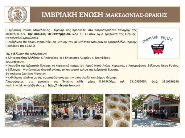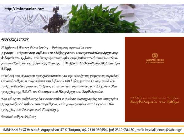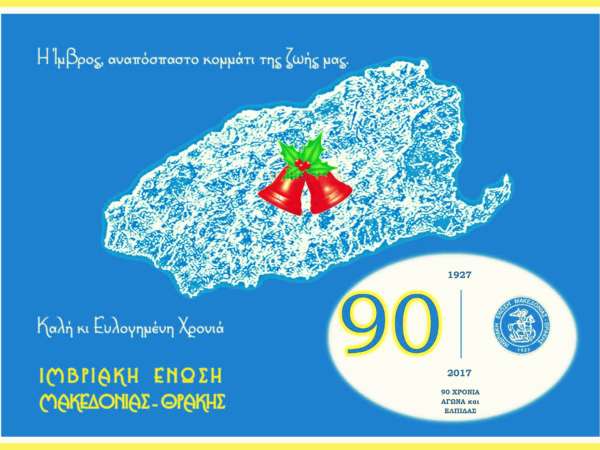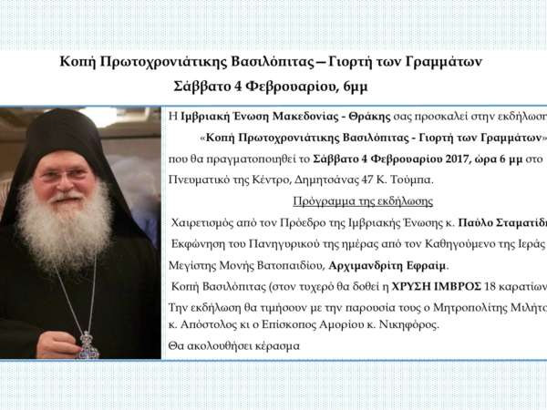 Κοπή Πρωτοχρονιάτικης Βασιλόπιτας – Γιορτή των Γραμμάτων στην Ιμβριακή Ένωση Η Ιμβριακή Ένωση Μακεδονίας – Θράκης σας προσκαλεί στην εκδήλωση «Κοπή Πρωτοχρονιάτικης Βασιλόπιτας – Γιορτή των Γραμμάτων» που θα πραγματοποιηθεί το Σάββατο 4 Φεβρουαρίου 2017, ώρα 6 μμ στο Πνευματικό της Κέντρο, Δημητσάνας 47 Κ. Τούμπα. Πρόγραμμα της εκδήλωσης Χαιρετισμός από τον Πρόεδρο της Ιμβριακής Ένωσης κ. Παύλο Σταματίδη Εκφώνηση του Πανηγυρικού της ημέρας από τον Καθηγούμενο της Ιεράς Μεγίστης Μονής Βατοπαιδίου, Αρχιμανδρίτη Εφραίμ. Κοπή Βασιλόπιτας (στον τυχερό θα δοθεί η ΧΡΥΣΗ ΙΜΒΡΟΣ 18 καρατίων) Την εκδήλωση θα τιμήσουν με την παρουσία τους ο Μητροπολίτης Μιλήτου κ. Απόστολος κι ο Επίσκοπος Αμορίου κ. Νικηφόρος. Θα ακολουθήσει κέρασμα