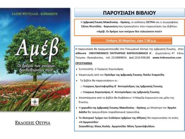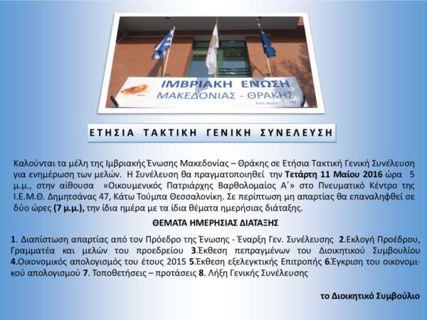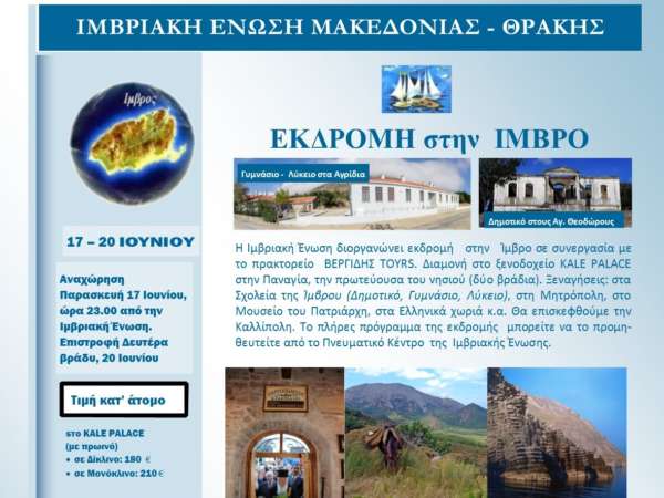 Η Τούμπα χορεύει για την Ίμβρο Η Ιμβριακή Ένωση Μακεδονίας – Θράκης σε συνεργασία με τη Δ΄ Δημοτική Κοινότητα του Δήμου Θεσσαλονίκης σας προσκαλούν την Τετάρτη 29 Ιουνίου 2016, ώρα 7 μμ, στην εκδήλωση «Η Τούμπα χορεύει για την Ίμβρο». Η εκδήλωση θα πραγματοποιηθεί στο γήπεδο του Μπάσκετ, που βρίσκεται πίσω από το Πνευματικό Κέντρο της Ιμβριακής Ένωσης, στη συμβολή των οδών Αμφιπόλεως και Πυλαίας. Συμμετέχουν τα Σωματεία: – Κέντρο έρευνας και μελέτης παραδοσιακού χορού και λαϊκού πολιτισμού «ΔΙΟΝΥΣΟΣ» – Σύλλογος Τερπνιωτών Θεσσαλονίκης – Πολιτιστικός Σύλλογος Αλμωπιέων Θεσσαλονίκης – Πολιτιστικός Σύλλογος Φίλων Τούμπας οι «Άνω Κάτω» – Πολιτιστικός Σύλλογος «Ο Φιλάρετος» – Πολιτιστικός Σύλλογος Ρωμιοσύνη – Πολιτιστικός Σύλλογος Μαλακοπής – ΚΑΠΗ Δήμου Θεσσαλονίκης. – Πολιτιστικό Σωματείο…