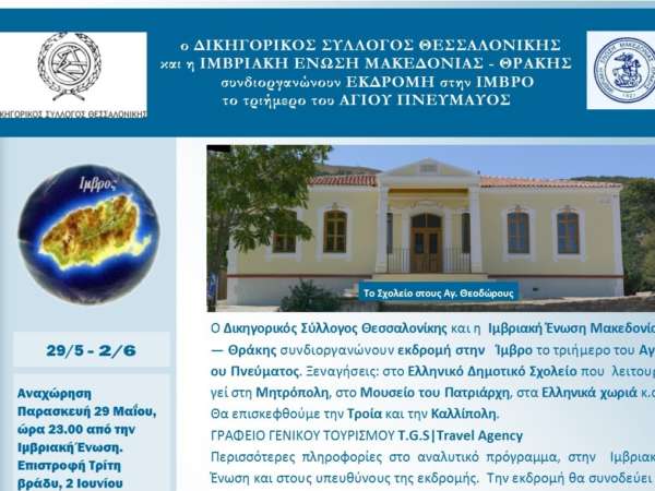 Εκδρομή στην Ίμβρο 23 – 26 Ιουλίου Η Ιμβριακή Ένωση Μακεδονίας — Θράκης οργανώνει εκδρομή στην Ίμβρο το τριήμερο 23-26 Ιουλίου. Τις ημέρες αυτές ο Οικουμενικός Πατριάρχης κ.κ. Βαρθολομαίος θα βρίσκεται στη γενέτειρα του. Ξεναγήσεις: στο Ελληνικό Δημοτικό Σχολείο που λειτουργεί στη Μητρόπολη, στο Μουσείο του Πατριάρχη, στα Ελληνικά χωριά κ.α. ΓΡΑΦΕΙΟ ΓΕΝΙΚΟΥ ΤΟΥΡΙΣΜΟΥ T.G.S|Travel Agency Περισσότερες πληροφορίες στο αναλυτικό πρόγραμμα, στην Ιμβριακή Ένωση και στον υπεύθυνο της εκδρομής κ. Γεώργιος Κομνηνάρας (Α΄ Αντιπρόεδρος της Ιμβριακής Ένωσης ) , οποίος θα συνοδεύει τους εκδρομείς. Το πρόγραμμα της εκδρομής μπορείτε να δείτε ΠΡ ΕΚΔΡΟΜΗΣ 23-7-2015 26-7-2015
